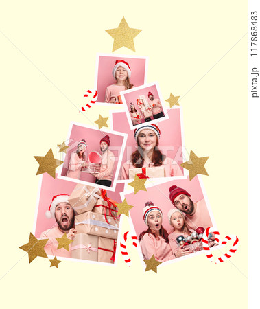Family Christmas moments arranged in shape of tree, with gold stars and candy canes, celebrating joy of season. Contemporary art collage.