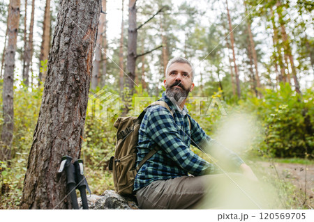 Handsome man standing in the middle of forest, observing the nature around. Forestbathing concept.