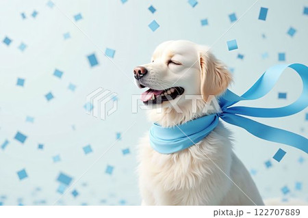 青いリボンをつけた幸せなゴールデンレトリーバーと舞い散る紙吹雪 – 誕生日・クリスマス・新年・ホワイ