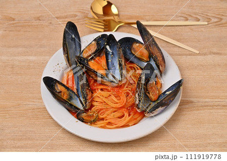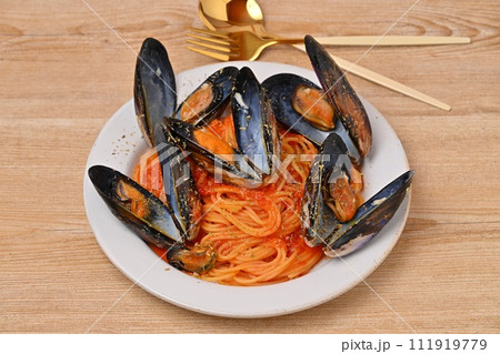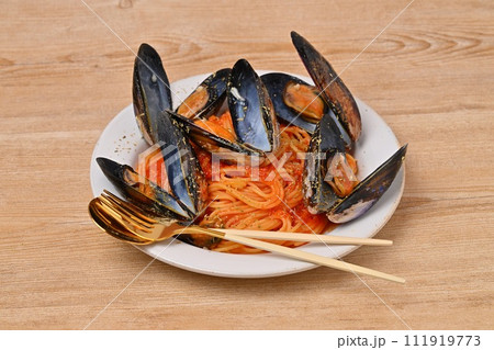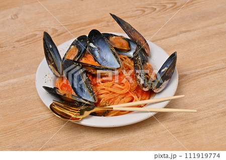 ムール貝のトマトパスタ、イタリアンパスタ、貝料理、スパゲッティ。
