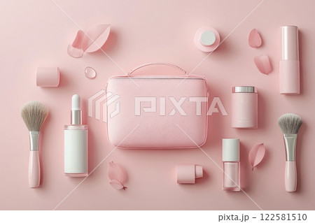 Beauty essentials arrangement flat lay makeup products soft pink background aesthetic display beauty and care concept