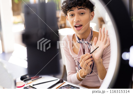 Recording makeup tutorial, transgender transgender woman using smartphone and beauty products