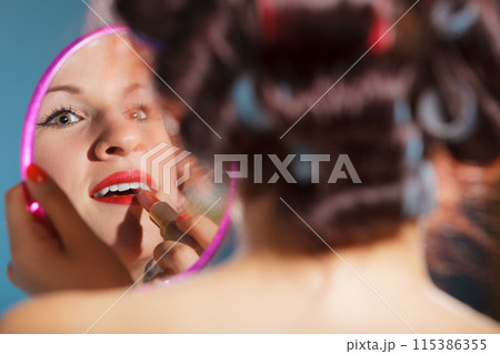 Girl applying make up red lipstick