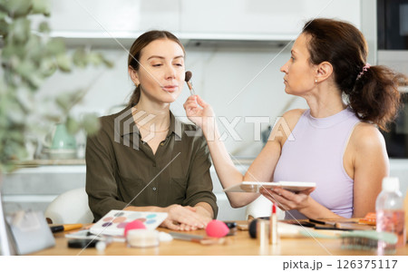 Adult woman doing makeup to young woman