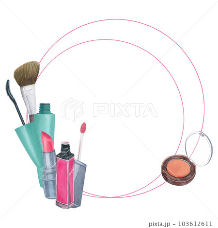 Round frame of beauty fashion illustrations on a white background. Mascara, blush, brush, lipstick, lip gloss, earrings, cosmetic bag, tubes of cream, macarons Watercolor hand drawn. Turquoise. Silver