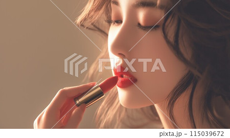 Close-up portrait featuring a person applying luxurious lipstick to enhance beauty. Elegant close-up of a young woman applying lipstick, highlighting glamour and aesthetics