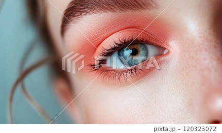 A close-up reveals a model's eye with soft peach eyeshadow, contrasting beautifully with her vivid blue iris, showcasing a stylish makeup look that enhances her features.