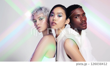 Diverse beauty portrait with glowing aura makeup. Trendy iridescent cosmetics on three models with different skin tones. Concept of inclusivity, modern fashion, and luminous style.