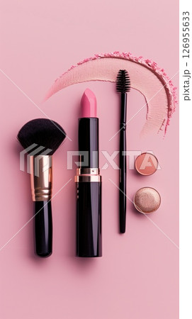 Lipstick and pigment arranged artistically on a light background, showcasing the beauty of cosmetics and makeup