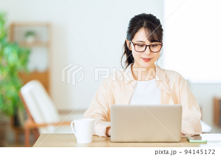 女性 パソコン テレワーク リビング ライフスタイル カジュアル