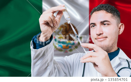 Doctor holding syringe on Mexico flag background. Medical professional holding syringe with Mexican flag in the background