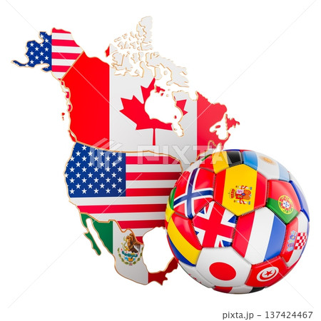 Soccer World Cup with USA Canada Mexico map, flags and soccer ball with country flags. 3D rendering