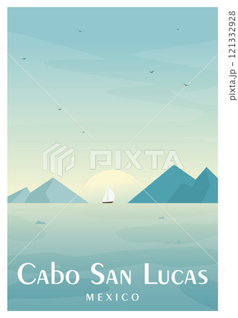 Mexico poster summer seascape. Cabo San Lucas flat illustration poster. Mediterranean landscape