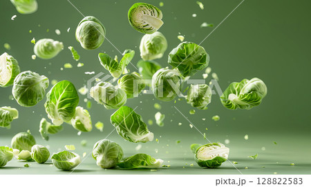 Brussels sprouts float effortlessly, capturing the essence of freshness and culinary art in this dynamic green composition.