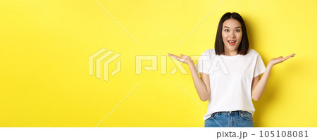 Beauty and fashion concept. Surprised asian girl spread hands sideways, holding on palms, pointing at two products, standing over yellow background
