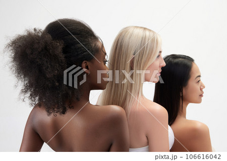 Back view image of three women of different race and skin tone, with bare shoulders standing against white background