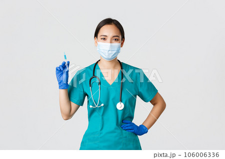 Covid-19, coronavirus disease, healthcare workers concept. Confident asian female nurse, doctor in medical mask and rubber gloves, holding syringe with vaccine, standing white background