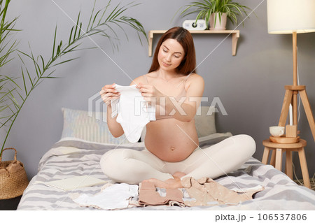 Young beautiful pregnant brown haired caucasian woman sitting in bed holding kids bodysuit packing things for maternity home.