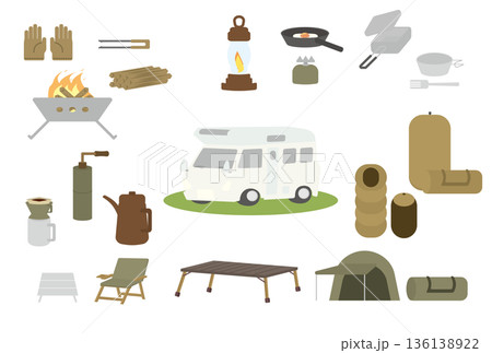 キャンピングカーとキャンプギアのセットイラスト