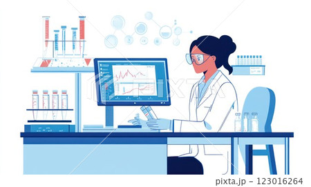 Scientist in lab coat analyzing test tube with mathematical formulas overlay