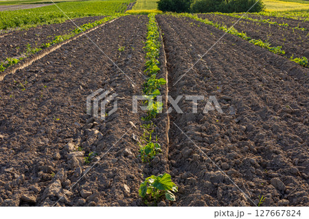 Rows of freshly tilled earth highlight the pumpkin plants thriving under the sun, showcasing nature's beauty in an agricultural setting
