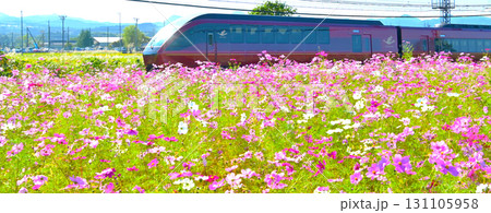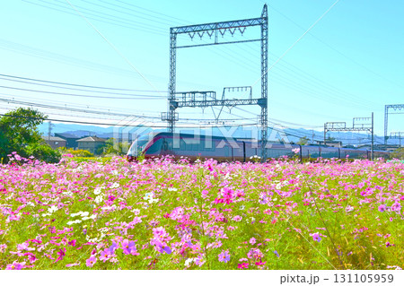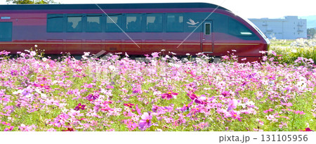 コスモス畑沿線を快走するメタリックレッドのひのとり