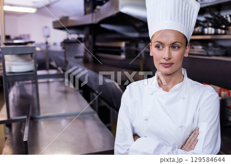 Female chef crossing arms, gazing left by stainless steel ovens in restaurant kitchen, copy space