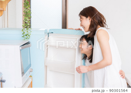 冷蔵庫の中を見る親子