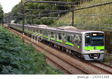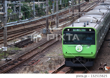 ビルの谷間をゆく山手線環状運転100周年車両(2025年)