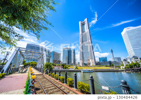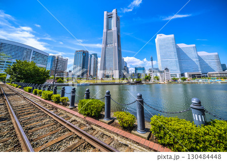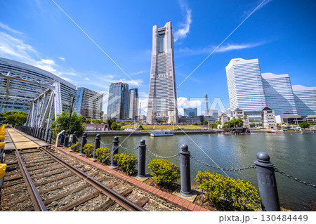 日本の横浜都市景観珍景レールがむき出しに…汽車道から横浜ランドマークタワーや賑わう日本丸…などを望む