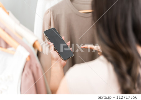 アパレルショップ・雑貨屋でスマートフォンを見ながら買い物をする女性客