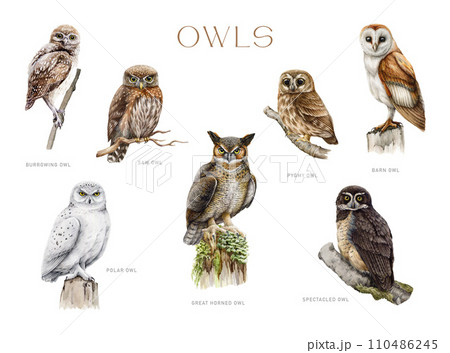 Owl birds watercolor illustration set. Various types of owls collection. Hand drawn barn, snowy, burrowing owl, pigmy owlet, eagle-owl forest wildlife predator avians. White background