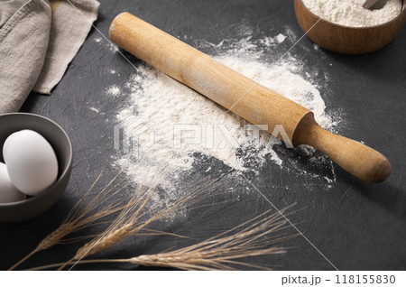 Organic baking ingredients. Wheat flour, eggs and rolling pin on a dark background close up.