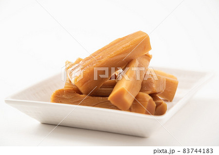 皿に盛った極太のメンマの箸上げイメージ【白背景・切り抜き】