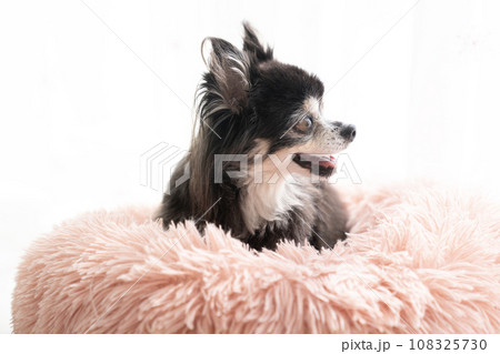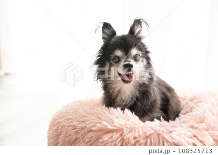 ピンクのベッドに入ったチワワのモアナ