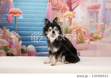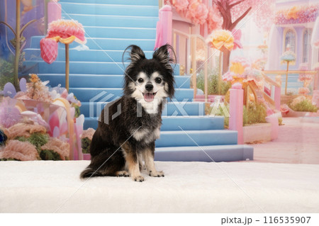 階段の前に立つチワワのモアナ
