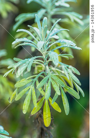 モクビャッコウの葉と朝露