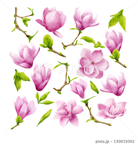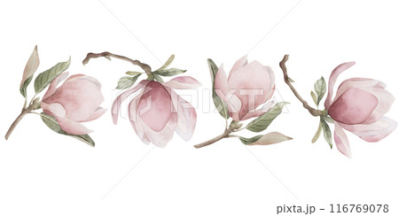 Watercolor magnolia branches and flowers