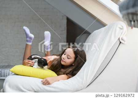 Girl lying on sofa and hugging rabbit on pillow.