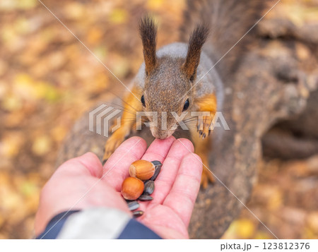 A squirrel in the autumn eats nuts from a human hand. Eurasian red squirrel, Sciurus vulgaris
