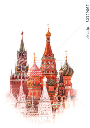 St. Basil Cathedral and Spasskaya tower, Red Square, Moscow, isolated on white background with white stamp mask. Symbol of Russia for your design.