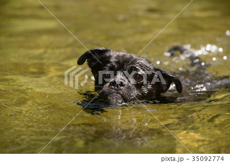 川で泳ぐ2歳のパグ