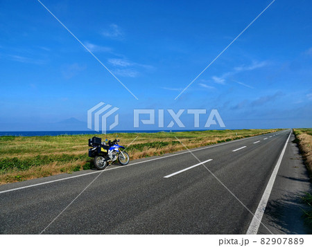 青空と地平線へ延々と遠くに続く道とバイク
