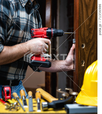 Carpenter at work repairs and installs the door lock. Carpentry.