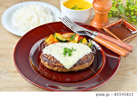 チーズハンバーグ。ハンバーグのモッツァレラチーズのせ。ライス(ご飯)とカボチャのスープを添えて。