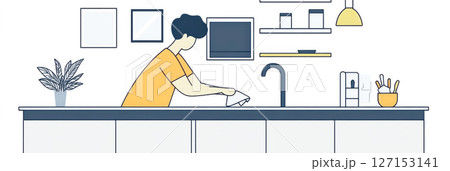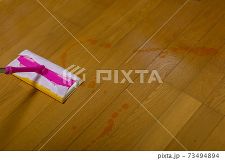 清掃業者 クリーニングスタッフ ビルメン モップをかける男性 清掃中 全身 イラスト素材