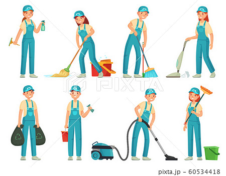 Cleaning workers. Professional cleaning staff, domestic cleaner worker and cleaners equipment. Home clean cartoon vector set
