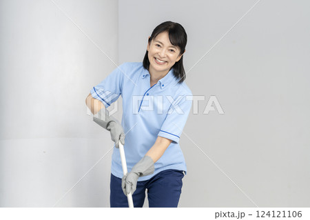 掃除用具を持っている女性