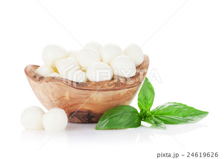 Mozzarella cheese sliced with basil leaf isolated on white background with clipping path and full depth of field