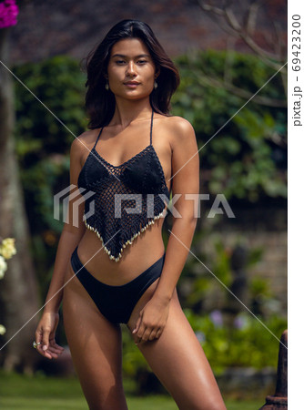 Portrait of young pretty sexy Asian woman wearing bikini in garden.